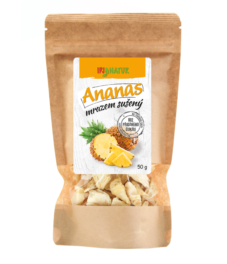 Mrazem sušený ananas jsou čistě přírodní křupavé kousky ananasu bez konzervantů a barviv zakonzervované odpařením vody z ledu. Tento proces se nazývá lyofilizace a odstraňuje z ovoce 98%-99% vody. Ovoce si tak zachovává téměř všechny původní vlastnosti jako čerstvé ovoce, obzvláště zůstávají zachované veškeré vitamíny, minerály a další zdraví prospěšné látky. Lze jej snadno a dlouhodobě skladovat. Lyofilizované ovoce má křupavou strukturu a široké využití od rychlé svačinky přes chutné a zdravé snídaňové směsi a smoothies až po přípravu široké škály pokrmů a dezertů. Ananas obsahuje přirozeně se vyskytující cukry, tuky, vlákninu, vitaminy skupiny B, vitamín A a C a minerály jako například vápník, železo, draslík a fosfor.