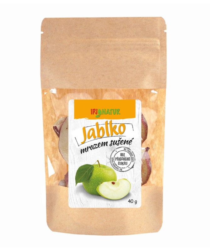 Mrazem sušená jablka jsou čistě přírodní křupavé plátky jablek bez konzervantů a barviv zakonzervované odpařením vody z ledu. Tento proces se nazývá lyofilizace a odstraňuje z ovoce 98%-99% vody. Ovoce si tak zachovává téměř všechny původní vlastnosti jako čerstvé ovoce, obzvláště zůstávají zachované veškeré vitamíny, minerály a další zdraví prospěšné látky. Lyofilizované ovoce je lehké, snadno a dlouhodobě skladovatelné. Má křupavou strukturu a široké využití od rychlé svačinky přes chutné a zdravé snídaňové směsi a smoothies až po přípravu široké škály pokrmů a dezertů. Jablka obsahují vitamíny a minerály, také pektin - rozpustnou vlákninu, která zajišťuje vysokou sytost a snadnou stravitelnost. Pro lidský organismus je přínosem kyselina listová a vitamín C. Jablka obsahují řadu minerálů jako je draslík, železo, hořčík nebo vápník.
