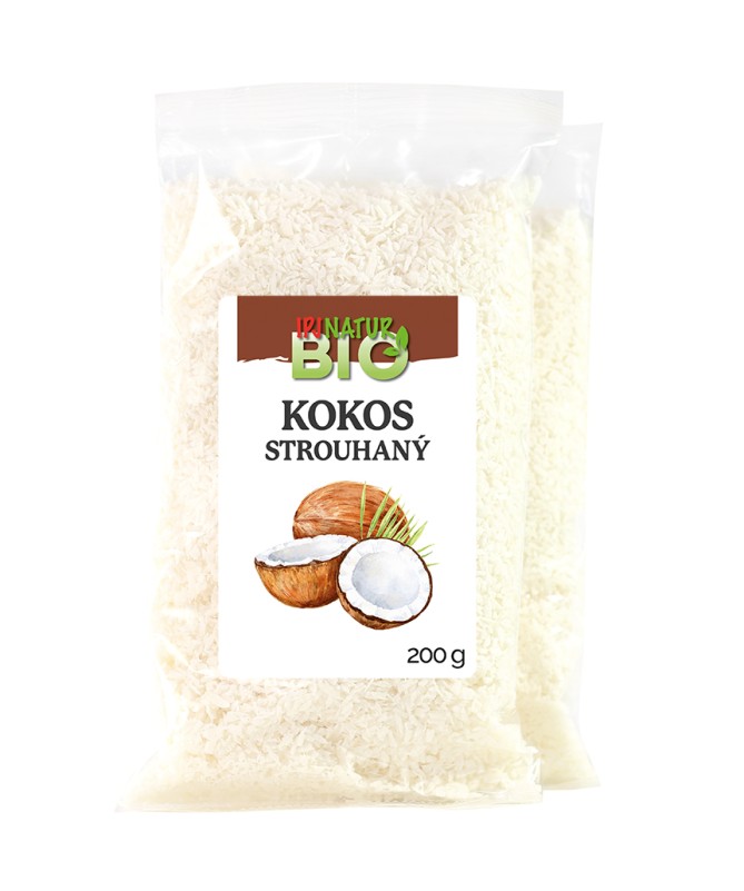 Strouhaný kokos v bio kvalitě je nastrouhané sušené jádro kokosového ořechu na střední hrubost. Kokosová jádra jsou ceněna jednak pro svůj velký obsah draslíku, ale také pro své antimikrobiální účinky. Strouhaný kokos je tradičně a hojně využíván jak v teplé tak studené kuchyni. Obsahuje zdravé žádoucí tuky, bílkoviny, vlákninu, vitamíny, antioxidanty, řadu minerálních látek a vitamínů jako je železo, fosfor, draslík, sodík, zinek, měď, mangan a vitamíny skupiny B.