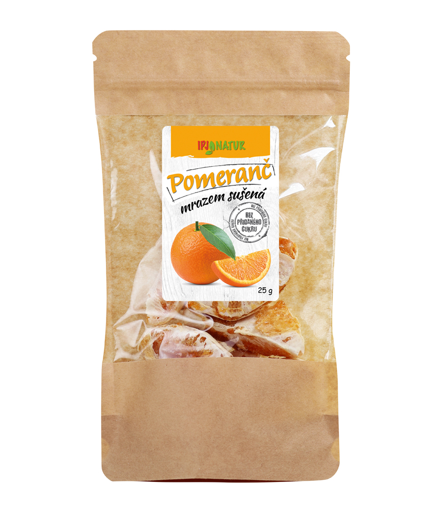 Mrazem sušený pomeranč jsou čistě přírodní křupavé kousky pomeranče bez konzervantů a barviv zakonzervované odpařením vody z ledu. Tento proces se nazývá lyofilizace a odstraňuje z ovoce 98%-99% vody. Ovoce si tak zachovává téměř všechny původní vlastnosti jako čerstvé ovoce, obzvláště zůstávají zachované veškeré vitamíny, minerály a další zdraví prospěšné látky. Lyofilizované ovoce je lehké, snadno a dlouhodobě skladovatelné. Má křupavou strukturu a široké využití od rychlé svačinky přes chutné a zdravé snídaňové směsi a smoothies až po přípravu široké škály pokrmů a dezertů. Pomeranč obsahuje velké množství vitamínu C, vlákniny, antioxidanty a minerály jako je vápník, hořčík, železo, draslík a sodík. Obsahuje také vodu, sacharidy, bílkoviny a malé množství tuků. Z vitamínů obsahuje vitamín A, B1, B2, B6 a vitamín E.